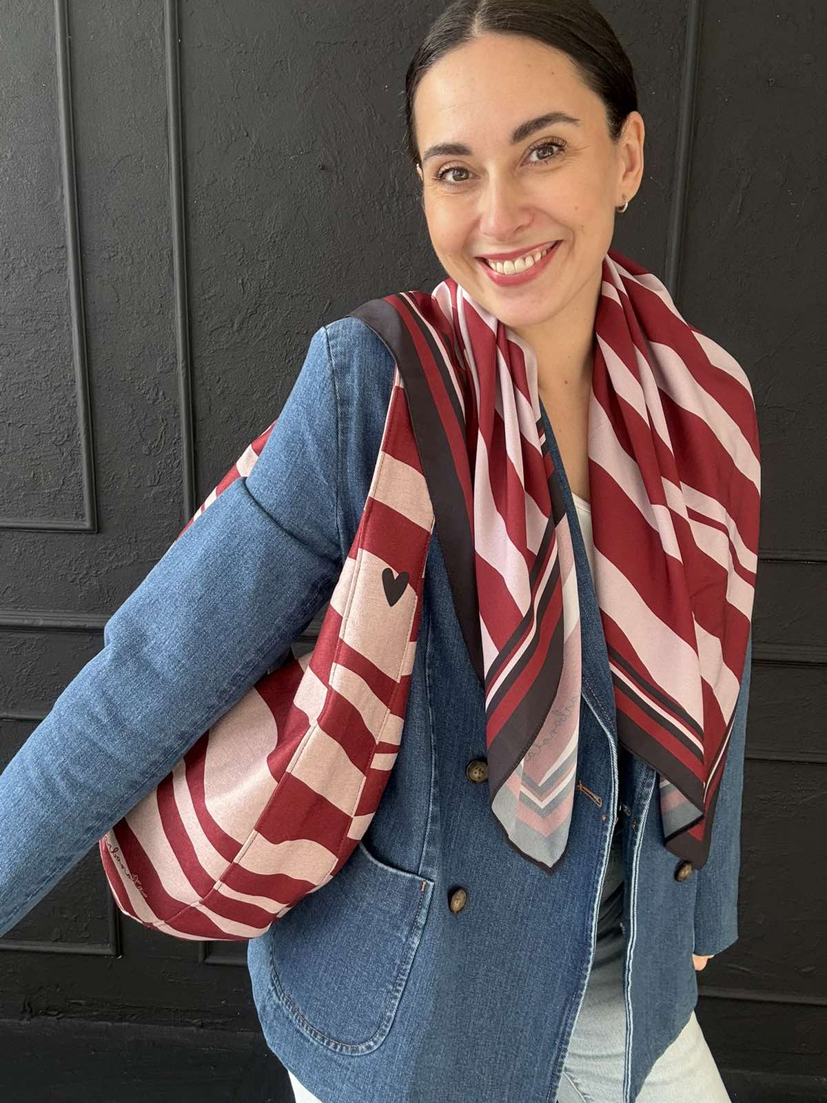 S dydis – perlenkus skarelę į trikampuo formą, tinka rišti ant kaklo. Susukis skarelę, galima nešioti kaip kaklaskarę.