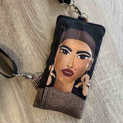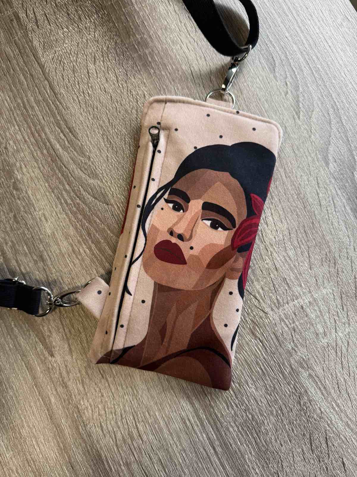 Kompaktiškas, veliūrinis telefoni rankinikas. Užsegamas metaline spaude. Priekyje maža kišenė su užtrauktuku. Petnešos ilgis reguliuojasi. Telpa telefonas, pasasas ir kelios kortelės.