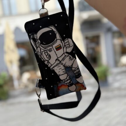Kompaktiškas, veliūrinis telefoni rankinikas. Užsegamas metaline spaude. Priekyje maža kišenė su užtrauktuku. Petnešos ilgis reguliuojasi. Telpa telefonas, pasasas ir kelios kortelės.