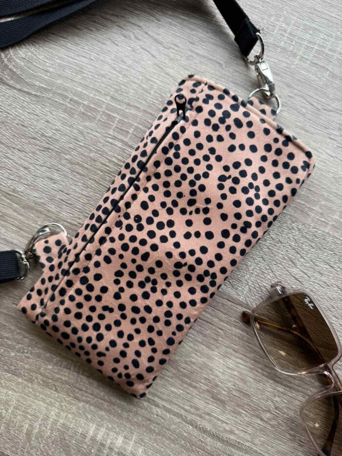 Kompaktiškas, veliūrinis telefoni rankinikas. Užsegamas metaline spaude. Priekyje maža kišenė su užtrauktuku. Petnešos ilgis reguliuojasi. Telpa telefonas, pasasas ir kelios kortelės.