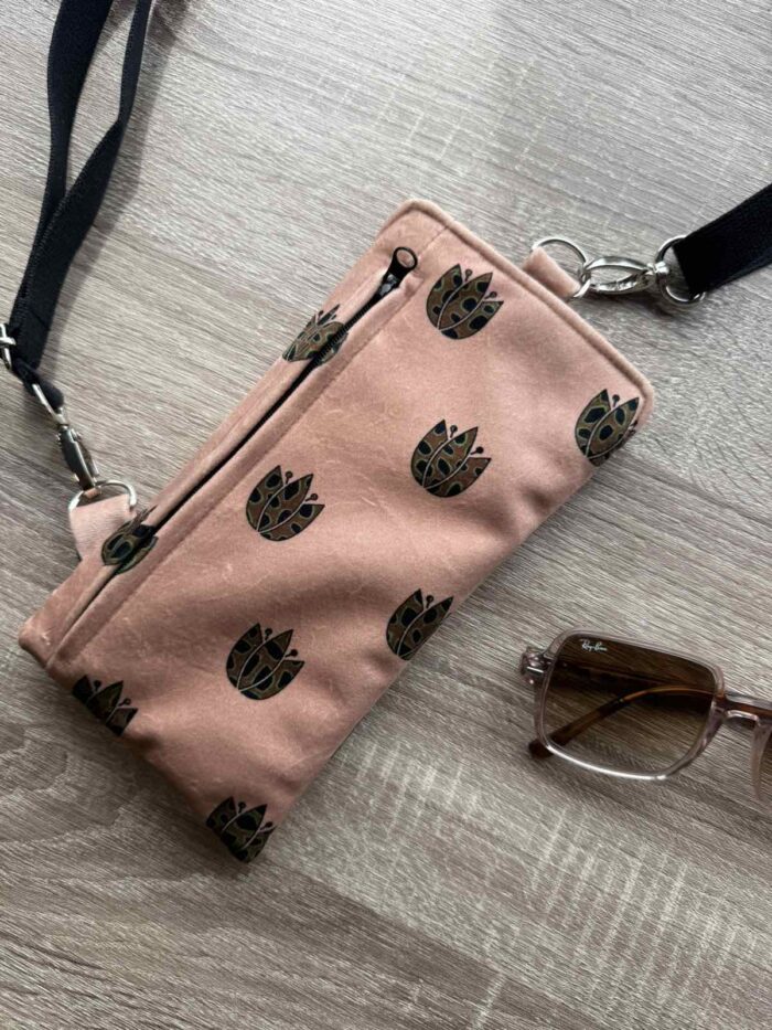 Kompaktiškas, veliūrinis telefoni rankinikas. Užsegamas metaline spaude. Priekyje maža kišenė su užtrauktuku. Petnešos ilgis reguliuojasi. Telpa telefonas, pasasas ir kelios kortelės.