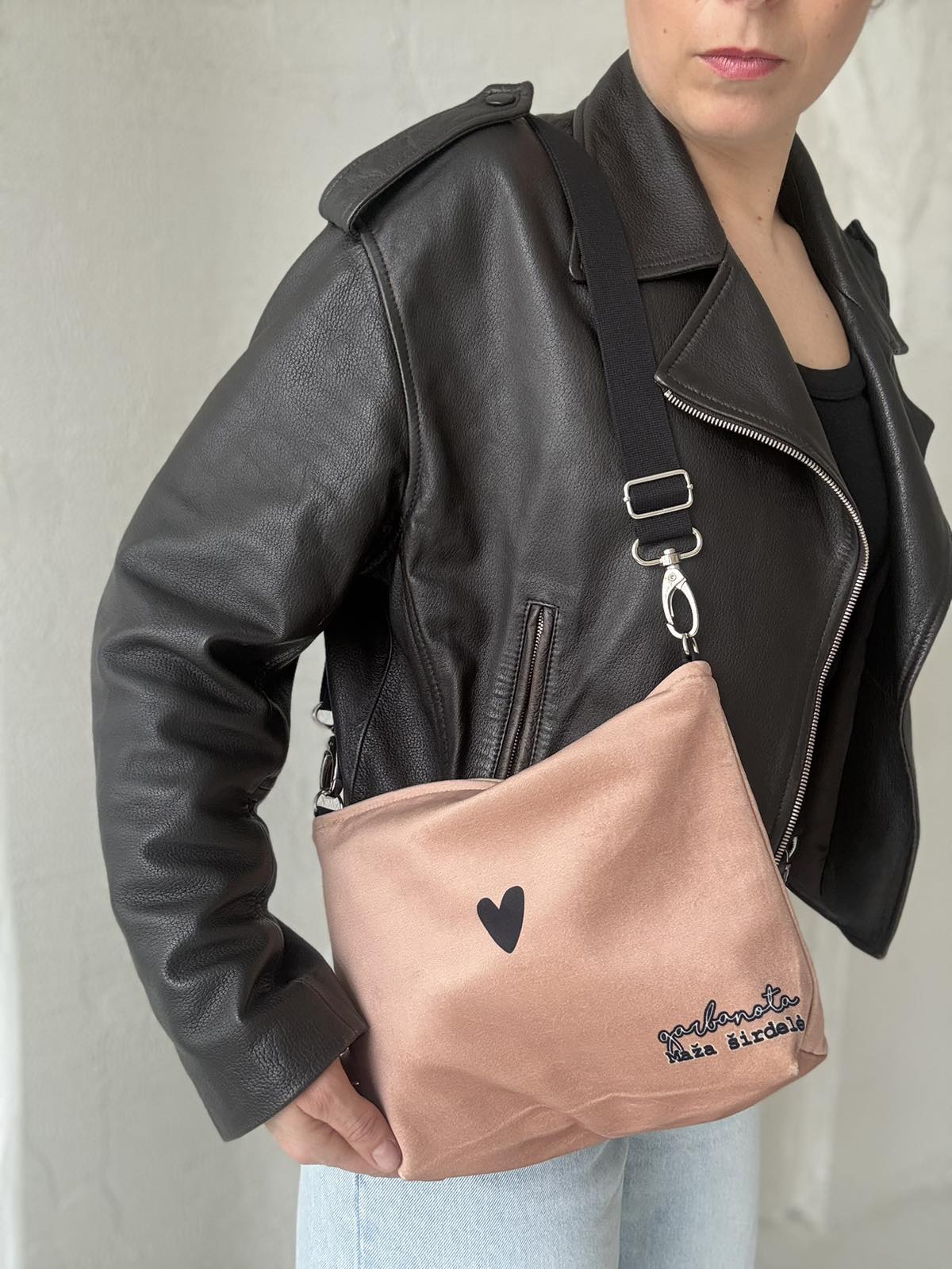 Rankinė per petį KREMINĖ, juoda širdelė