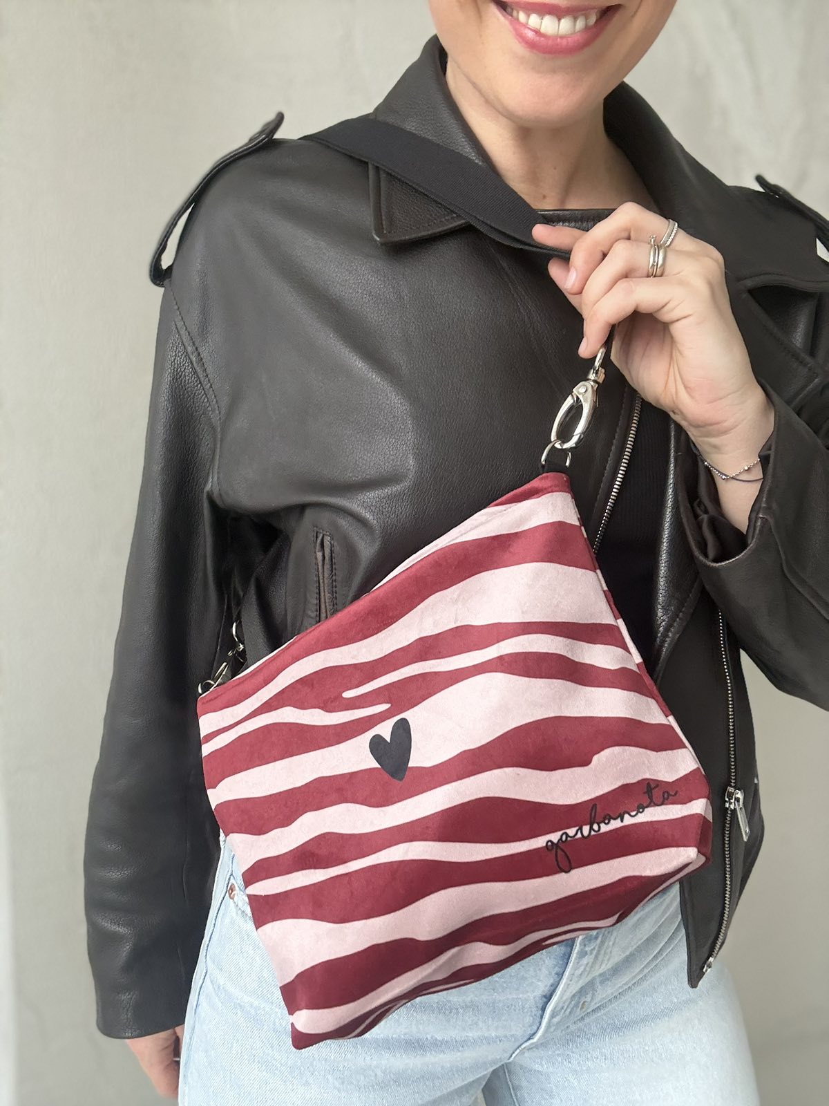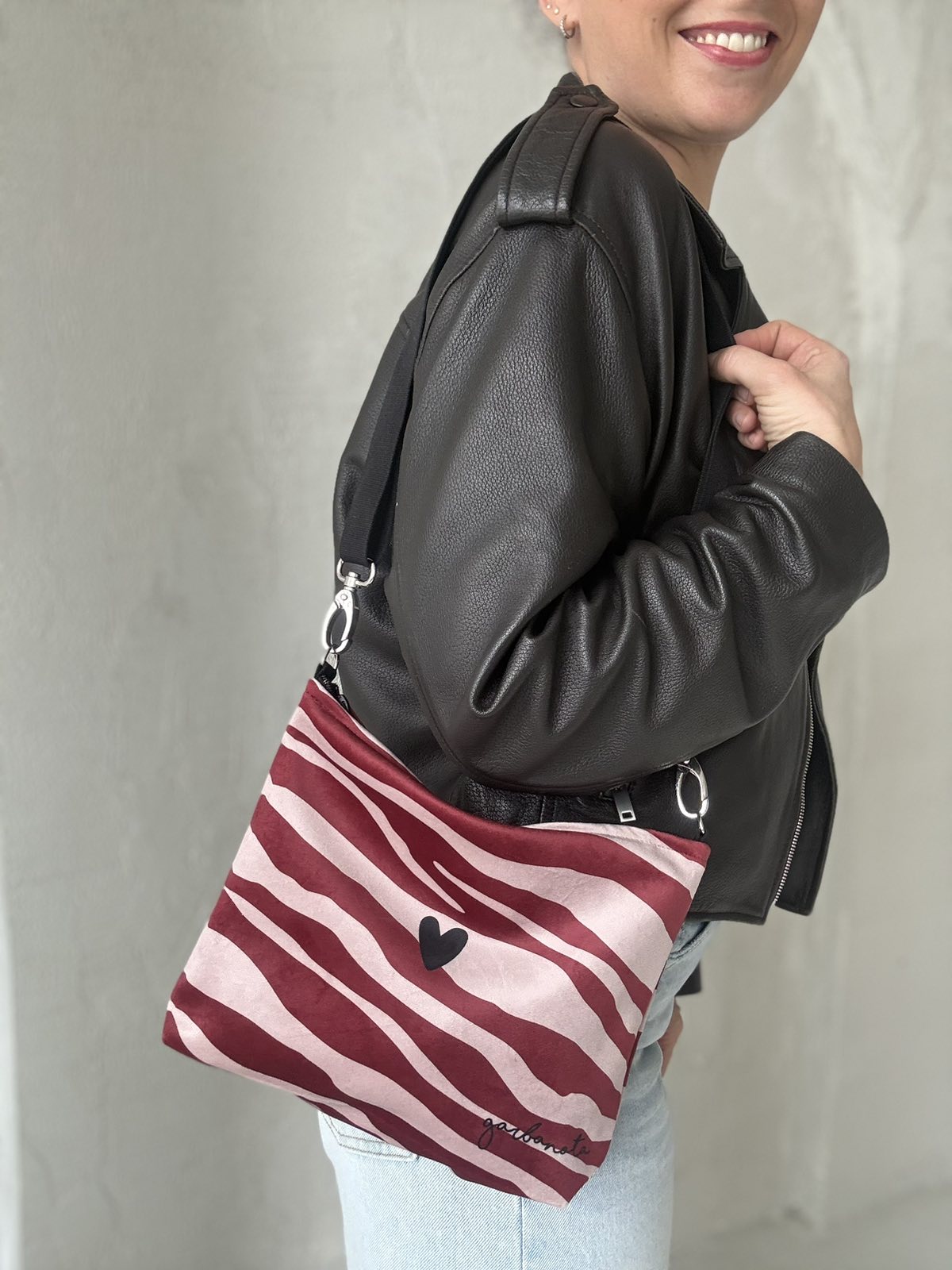 Skirtingų petnešų pagalba, garbanota rankinę per petį galima akimirksniu pakeisti.