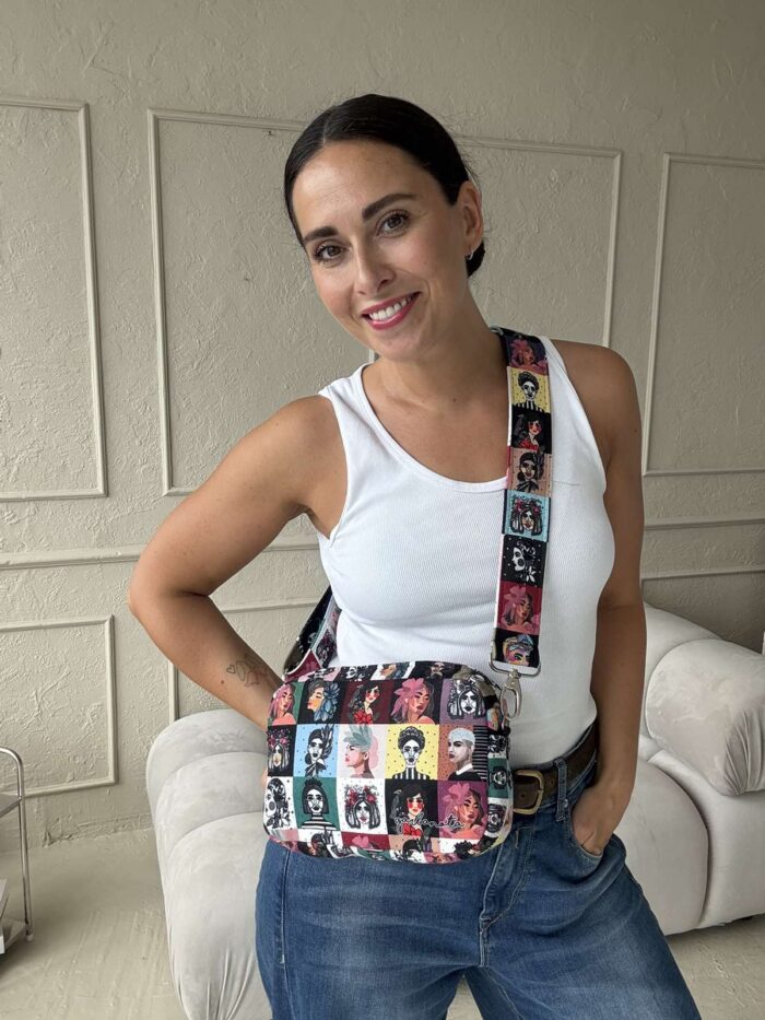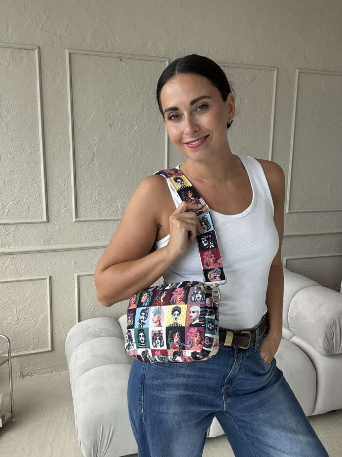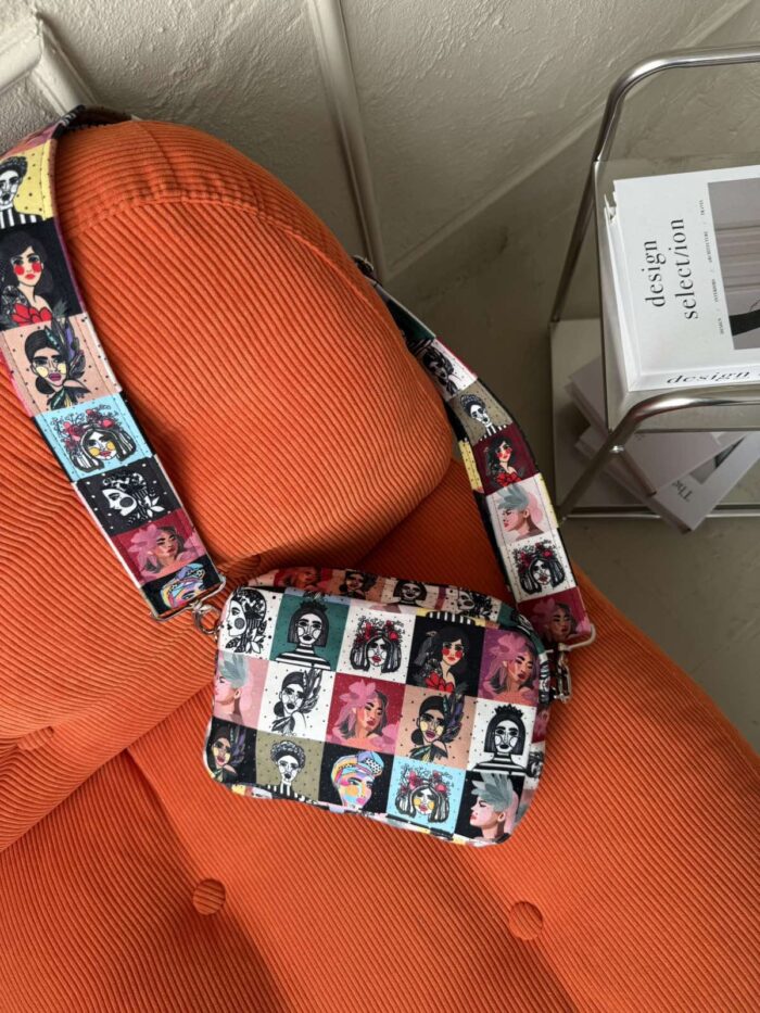 Viduje garbanota pamušalas ir kišenė. Rankinukai lengvi, talpūs ir puikiai nešiojasi. Petnešos ilgis reguliuojasi. Galima nešioti skersai per petį, o galima nešioti ir ant peties. Skalbiasi 30°C.