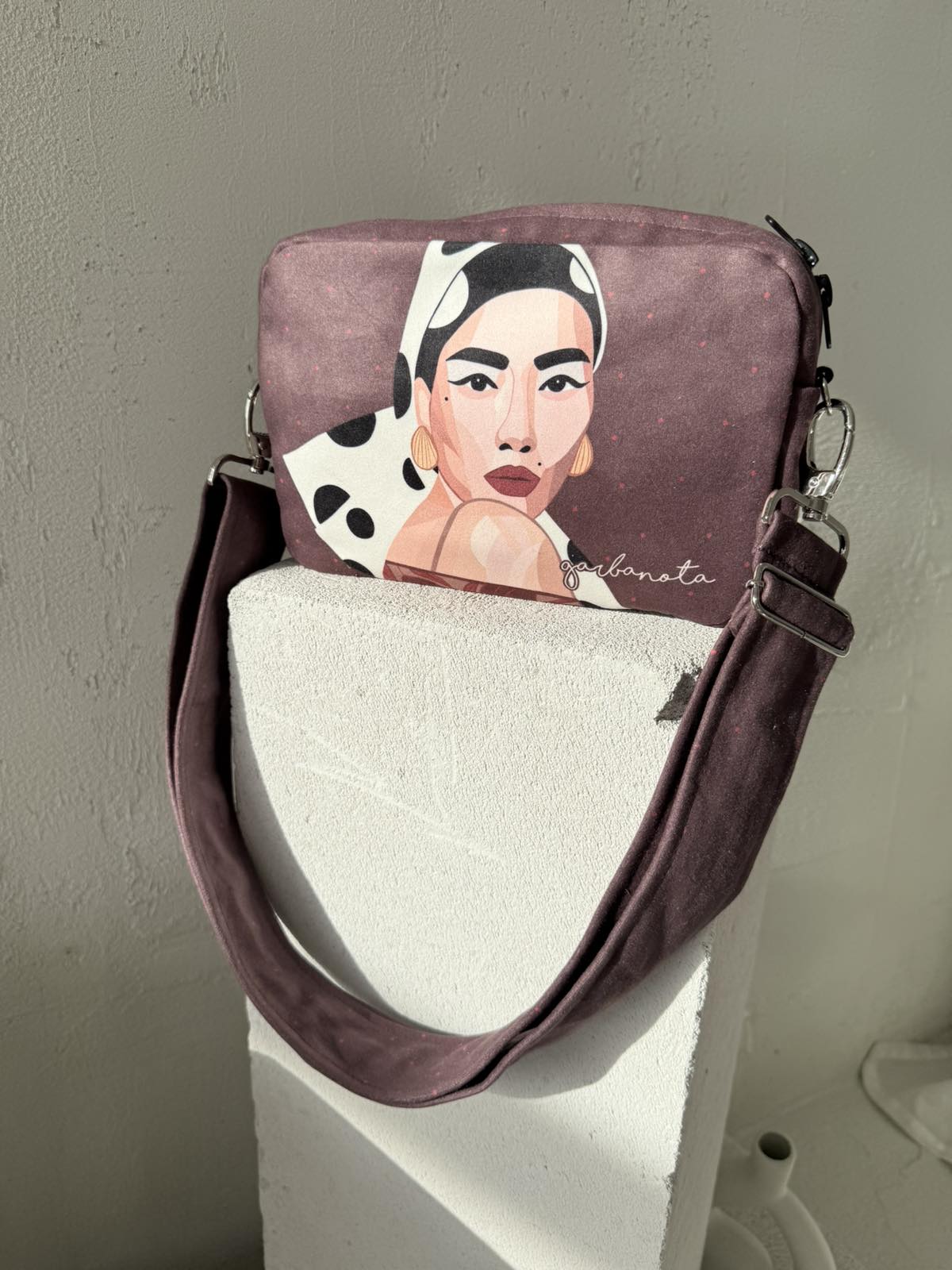 GARBANOTA RANKINUKAI tai ypatingos formos rankinukai. Jie pagaminti iš audinio, kuris primena zomšą. Šiek tiek laiko formą, o tai labai svarbu, nes toks mano užmanymas. Rankinukas - griežtos, stačiakampio formos, be pakietinimų viduje.