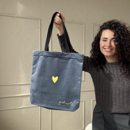 Rankinė Geltona širdelė, pilkam fone